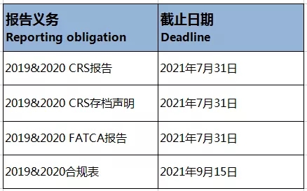 申報開曼公司/開曼群島FATCA和CRS的截止日期(201920):