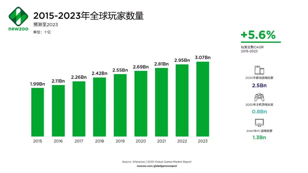 據Newzoo最新《2020年全球游戲市場報告》預測,全球游戲市場規模將達到1593億美元,同比增長9.3%;全球游戲玩家數量將持續增長,到2023年將超過30億。
